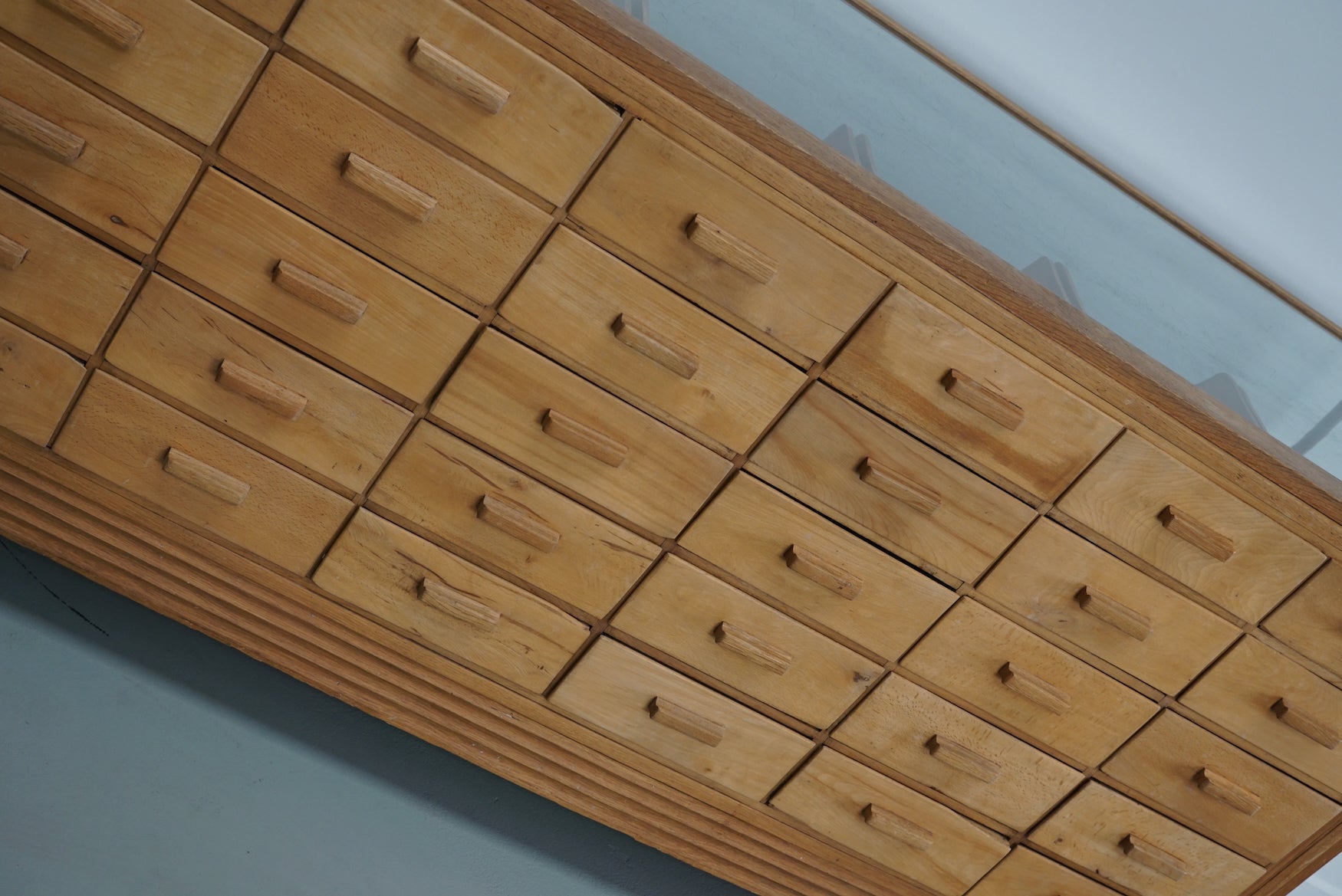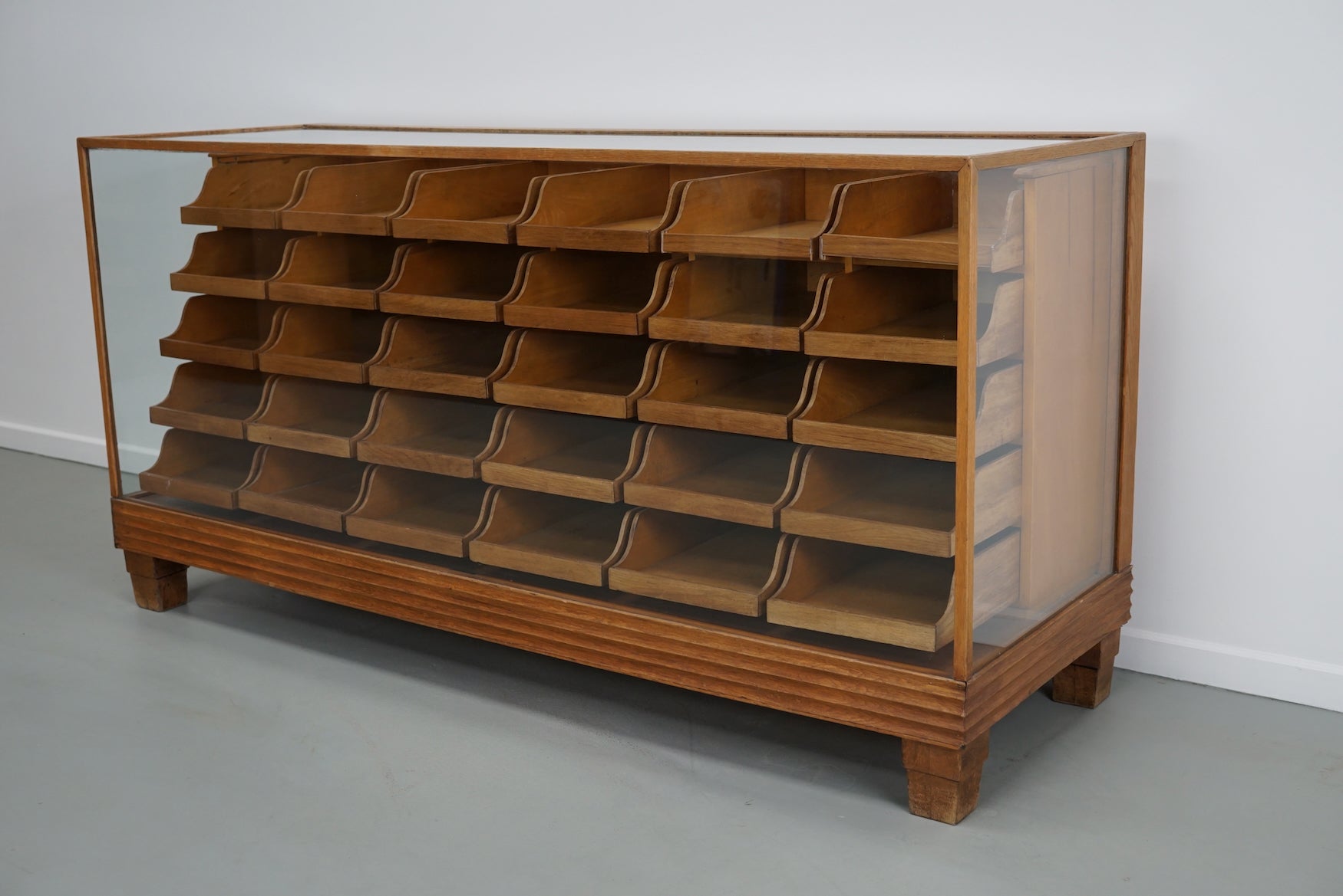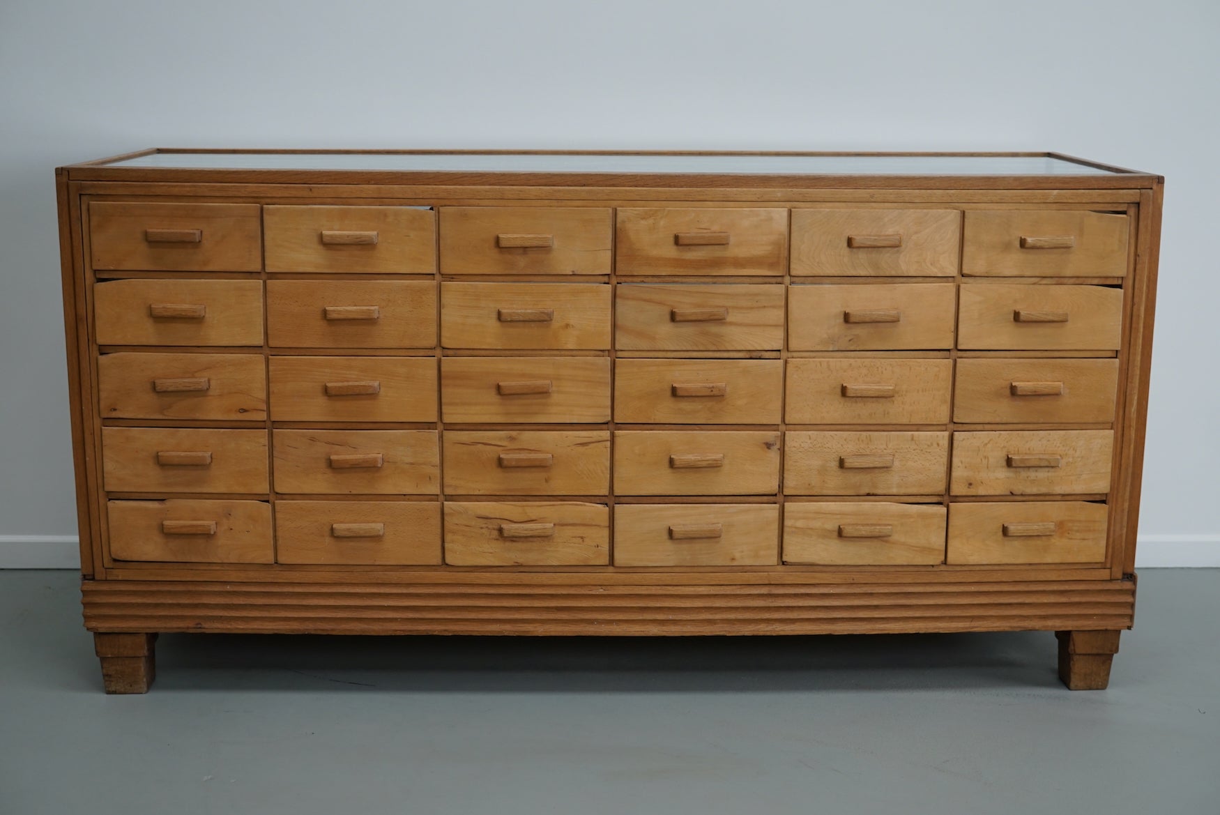 This vintage haberdashery shop counter dates from the 1920/30s and was made in England. It features a solid wooden frame with wooden handles, a glass casing and drawers in maple. The interior dimensions of the drawers are: D 41 / 44 / 48 / 52 / 56 x W 25 x H 9 cm.