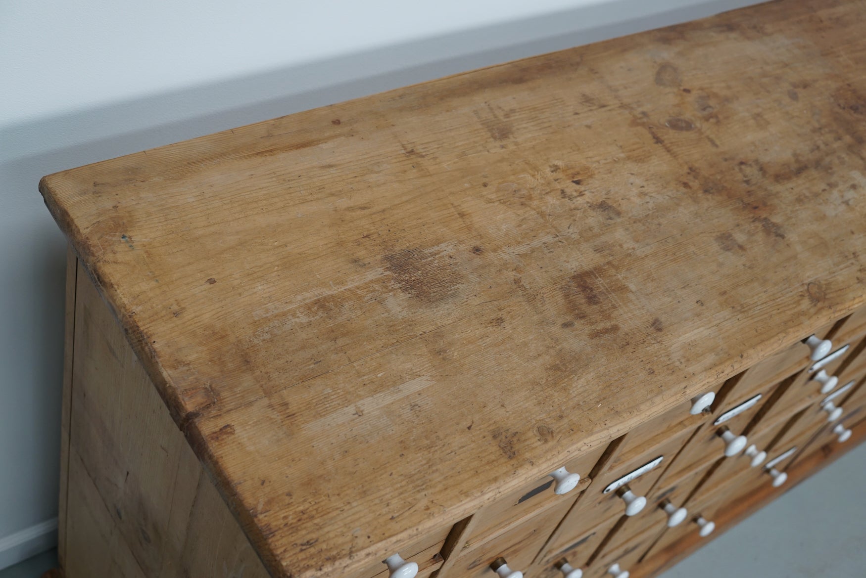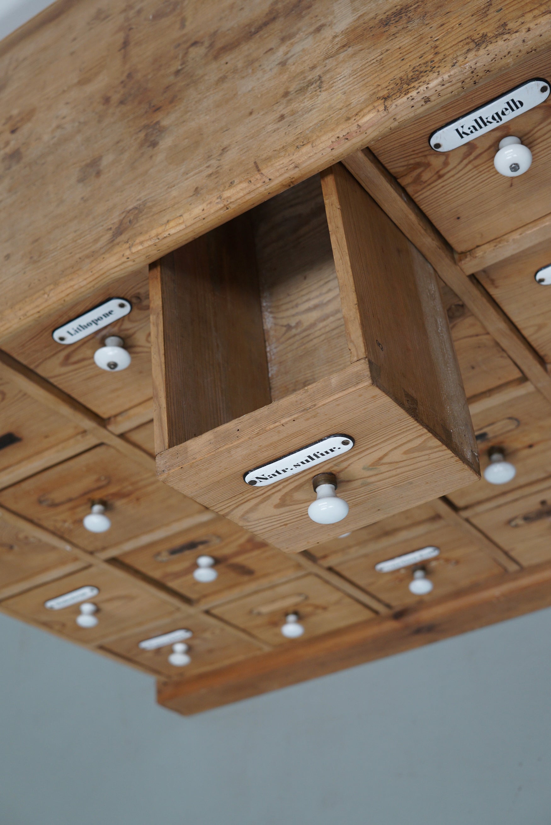 This apothecary bank of drawers was designed and made circa 1900 in Germany. It is made from pine with porcelain knobs and enamel name plates for the contents which were pigments. The cabinet has retained a rich patina with some natural distressing. The interior dimensions of the drawers are: DWH 35 x 15 x 15 cm.
