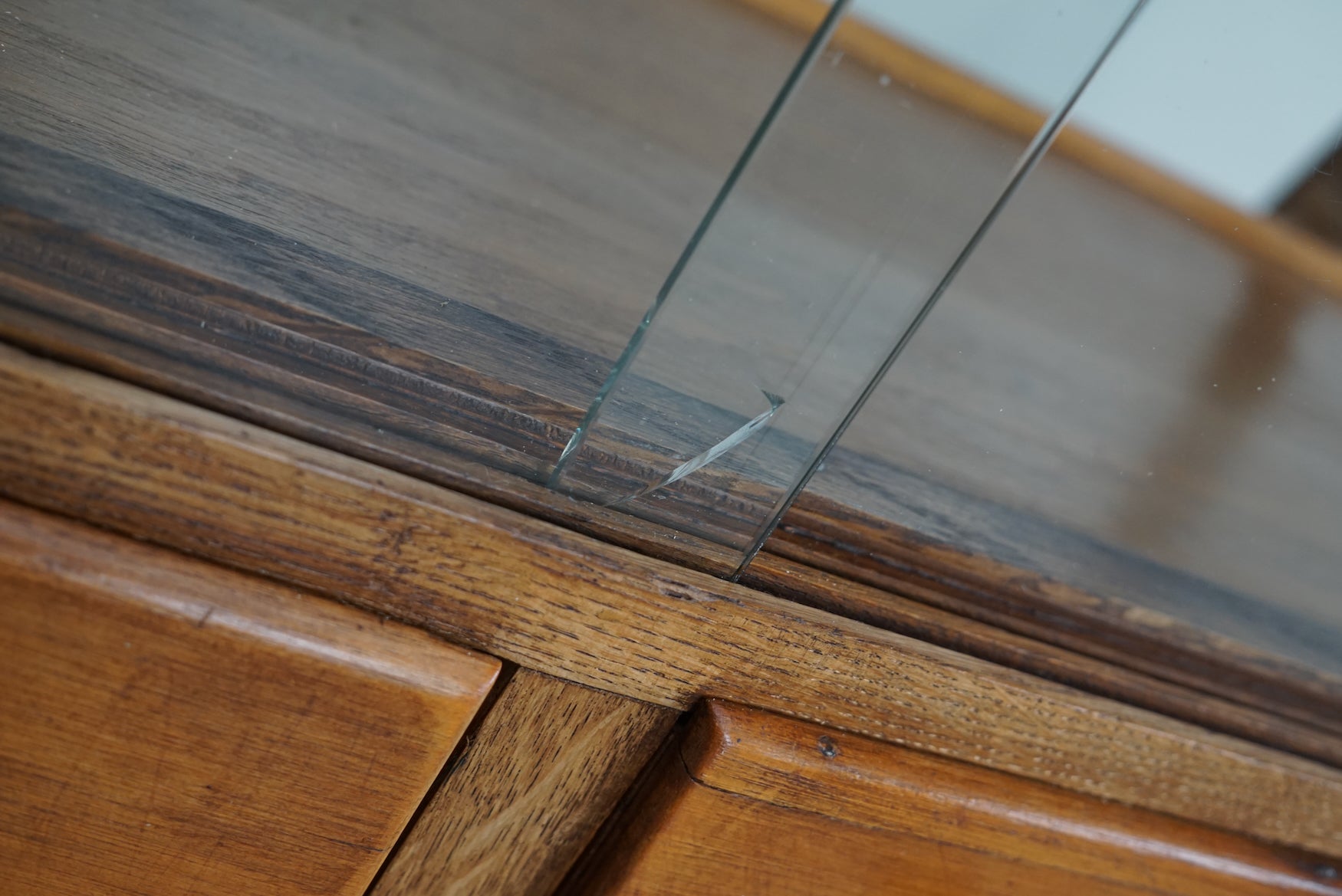 This vintage maple haberdashery shop counter dates from the 1920/30s and was made in England. It features a solid wooden frame with bakelite handles, a glass casing and drawers in maple. The interior dimensions of the drawers are: (4x) D33 cm x W39,5 cm x H13,5 cm (4x) D38 cm x W39,5 cm x H13,5 cm (4x) D43 cm x W39,5 cm x H13,5 cm (4x) D48 cm x W39,5 cm x H13,5 cm
