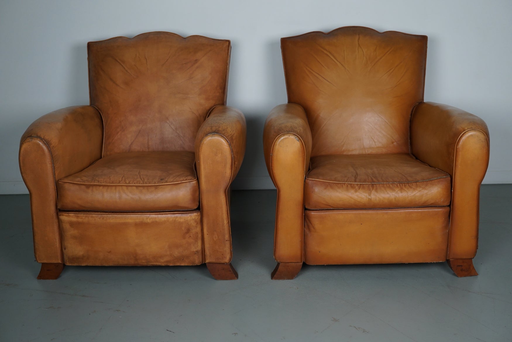 Pair of French Cognac Moustache Back Leather Club Chairs, 1950s