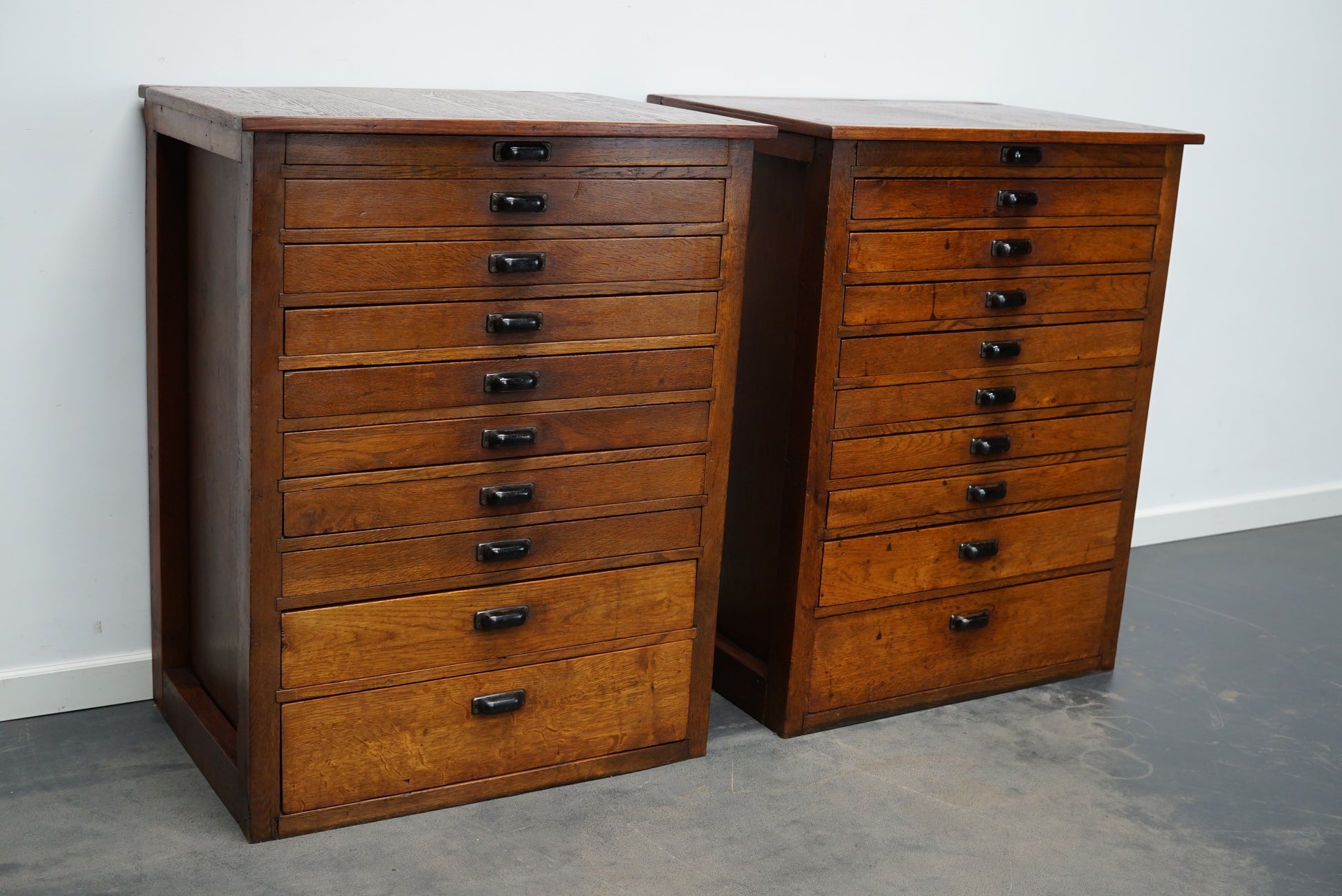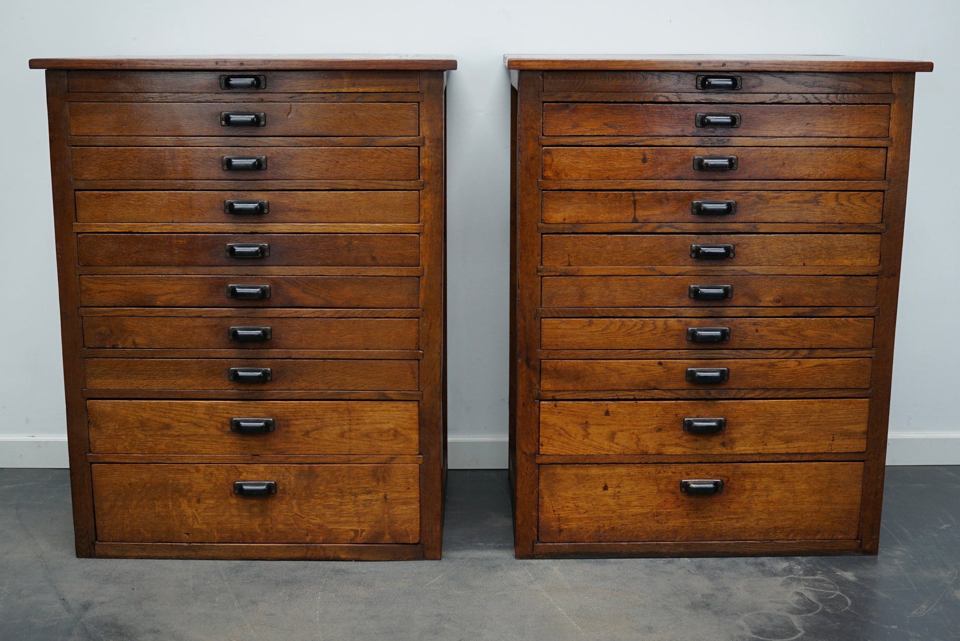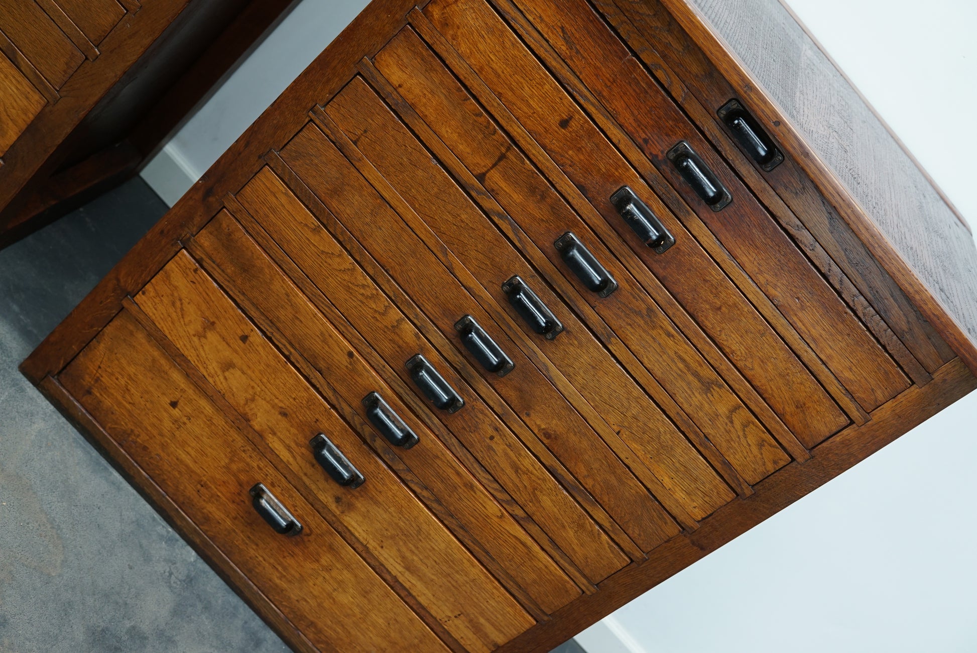 These jewelers / watchmakers cabinets were designed and made circa 1930/1940 in the Netherlands. They feature 10 oak fronted drawers in different sizes: DWH 41 x 53 x 3 / 5 / 9 / 14 cm.