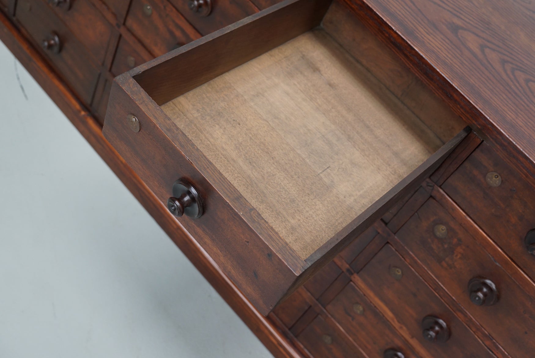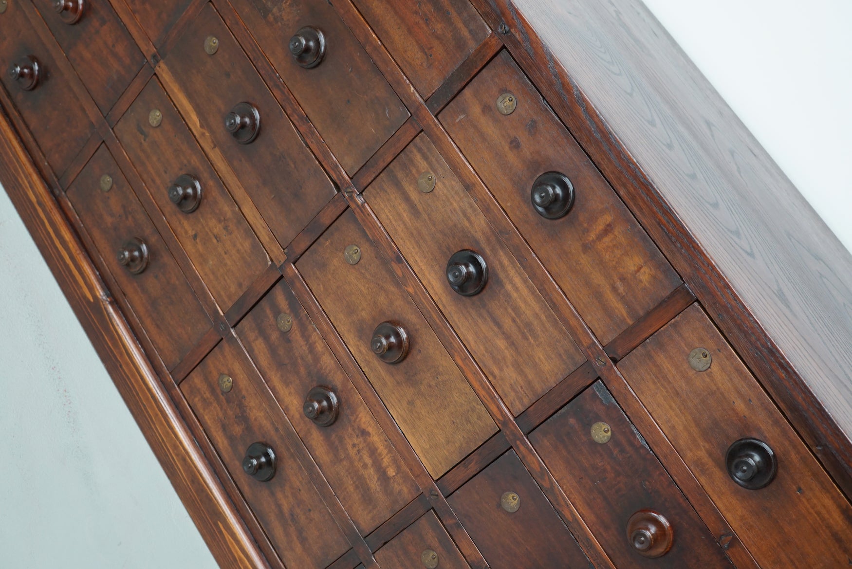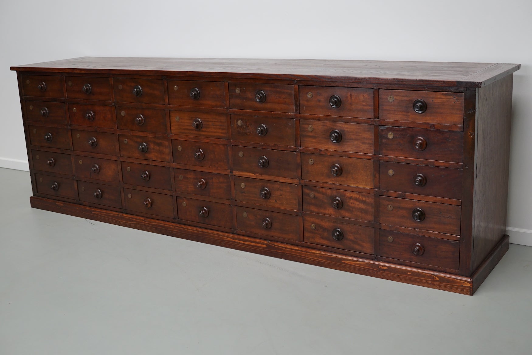 This apothecary bank of drawers was designed and made in Belgium and used in a hardware store in Antwerp. It is made from solid wood with wooden knobs and brass numbers. The cabinet has retained a rich patina with some natural distressing. The drawers are fully functional but show signs of age and use. Overall the cabinet remains in a good solid condition. The interior dimensions of the drawers are: D 44 x W 31 x H 10.5 cm. Two rows of five have different measurements as the cabinet was built around a column, see photo's. We have a pair of these cabinets available the second one is nearly identical.