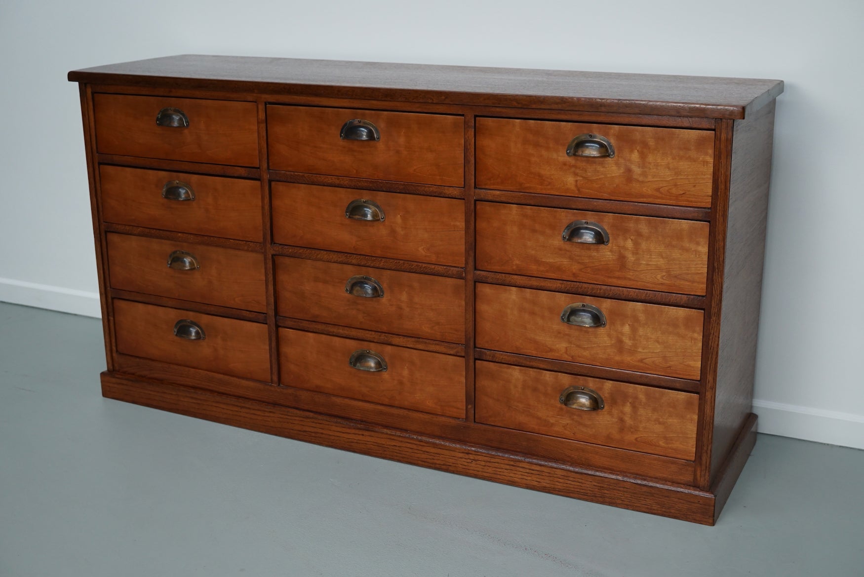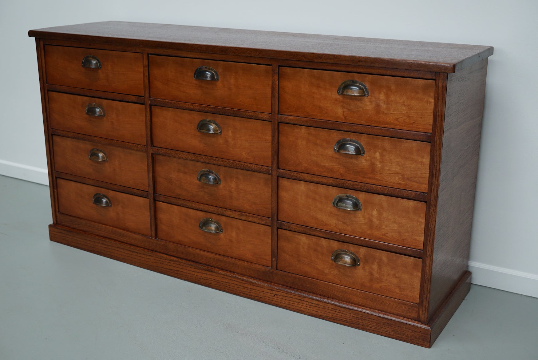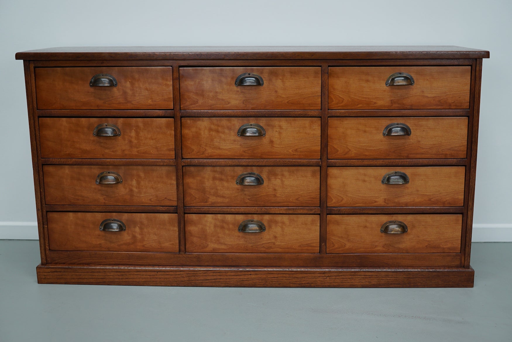 This apothecary / filing cabinet was produced during the 1930s in the Netherlands. It features 12 drawers with brass hardware. The interior dimensions of the drawers are: DWH 35 x 42 x 12 cm