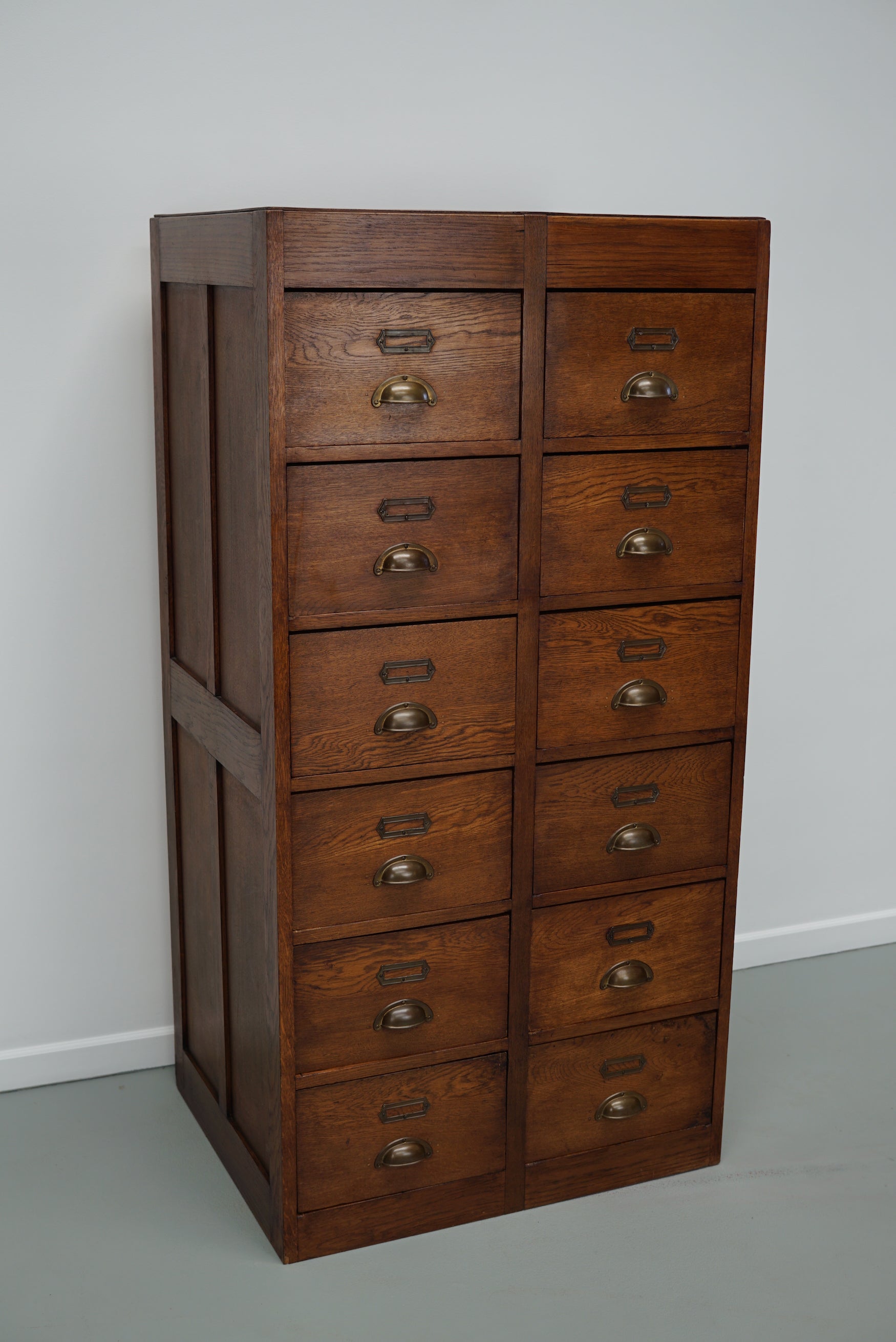 This apothecary / filing cabinet was produced during the 1930s in the Netherlands. This piece features 12 large drawers with brass hardware. The interior dimensions of the drawers are: DWH 48 x 30 x 17 cm.