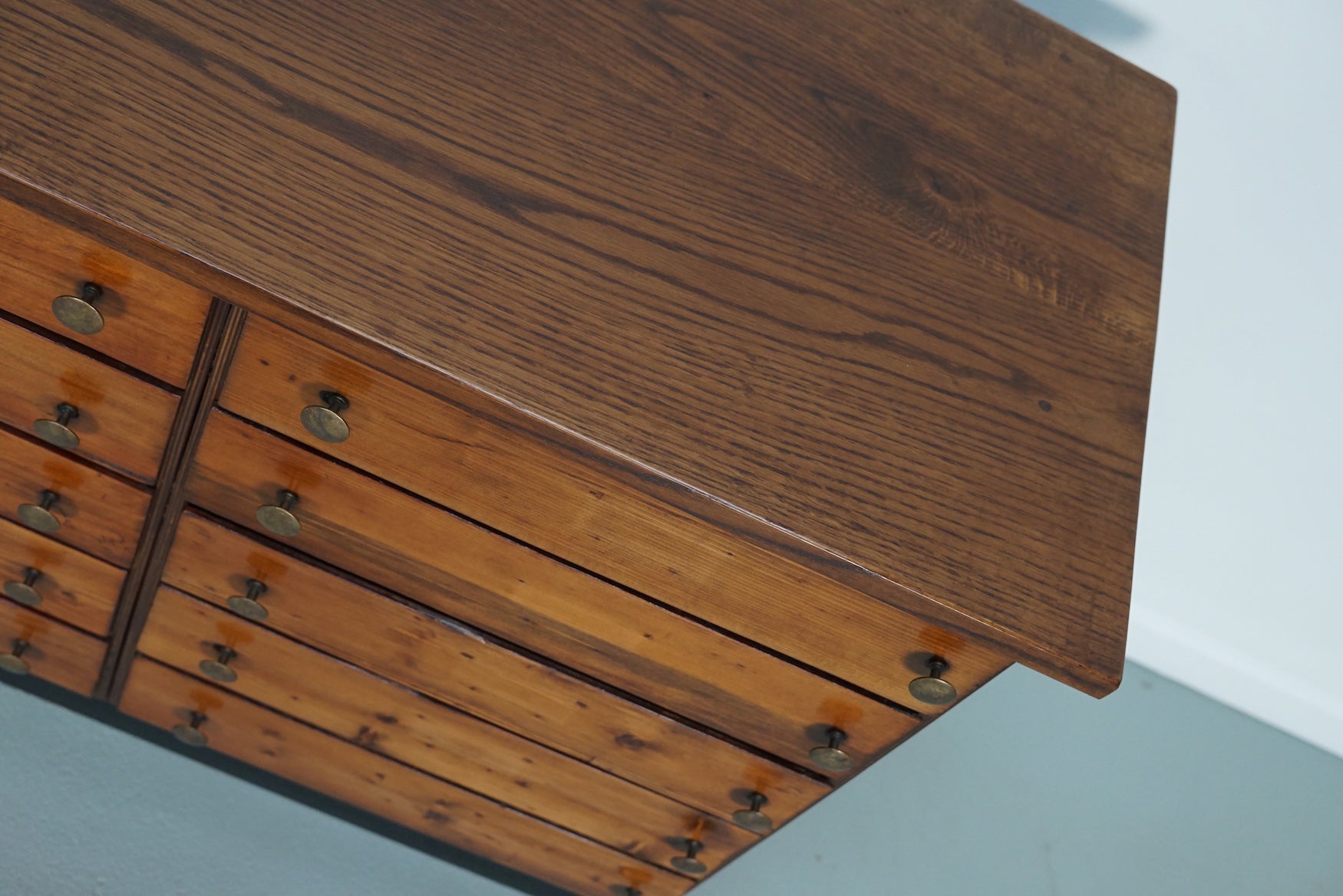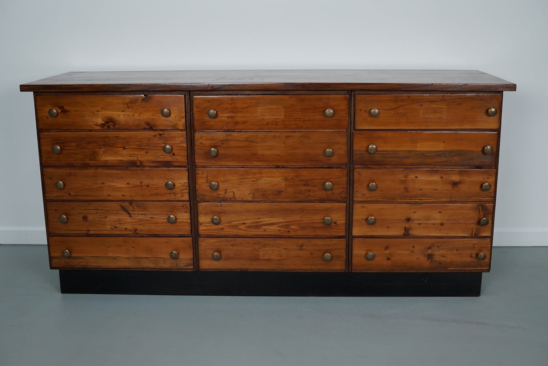 This apothecary cabinet was produced during the 1950s in Germany. This piece features 15 drawers with nice brass knobs. The interior dimensions of the drawers are: D x W x H 43 x 40 x 9 cm. It remains in a good restored condition.